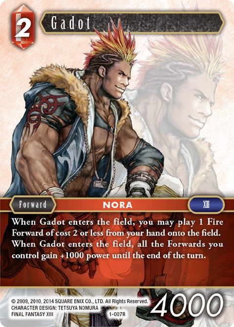 When Gadot enters the field, you may play 1 Fire Forward of cost 2 or less from your hand onto the field. When Gadot enters the field, all the Forwards you control gain +1000 power until end of the turn.