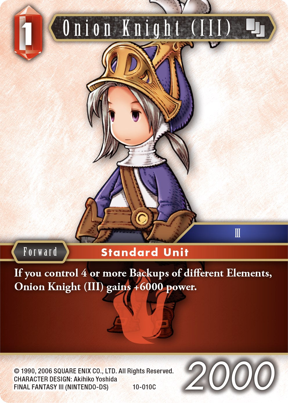 If you control 4 or more Backups and if the Backups you control are all of different Elements, Onion Knight (III) gains +6000 power.