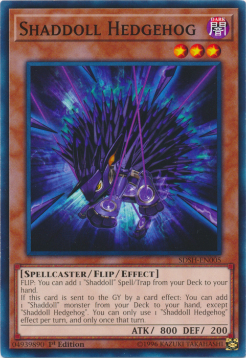 FLIP: You can add 1 "Shaddoll" Spell/Trap from your Deck to your hand. If this card is sent to the GY by a card effect: You can add 1 "Shaddoll" monster from your Deck to your hand, except "Shaddoll Hedgehog". You can only use 1 "Shaddoll Hedgehog" effect per turn, and only once that turn.