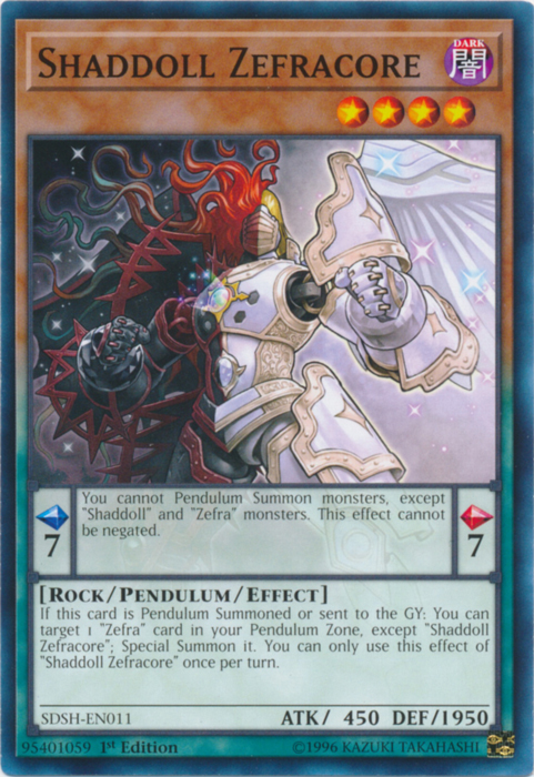 If this card is Pendulum Summoned or sent to the GY: You can target 1 "Zefra" card in your Pendulum Zone, except "Shaddoll Zefracore"; Special Summon it. You can only use this effect of "Shaddoll Zefracore" once per turn.