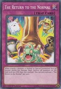 When exactly 1 monster is Normal or Special Summoned face-up (except during the Damage Step): Destroy all monsters on the field with less ATK than that monster. You can only activate 1 "The Return to the Normal" per turn.